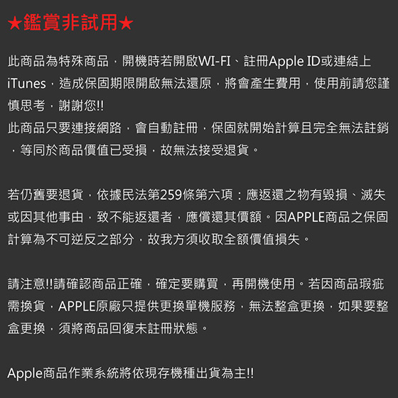 1、由於本商品為特殊3C產品,商品經連上網路(含wifi)登入Apple ID或連結上iTunes後,